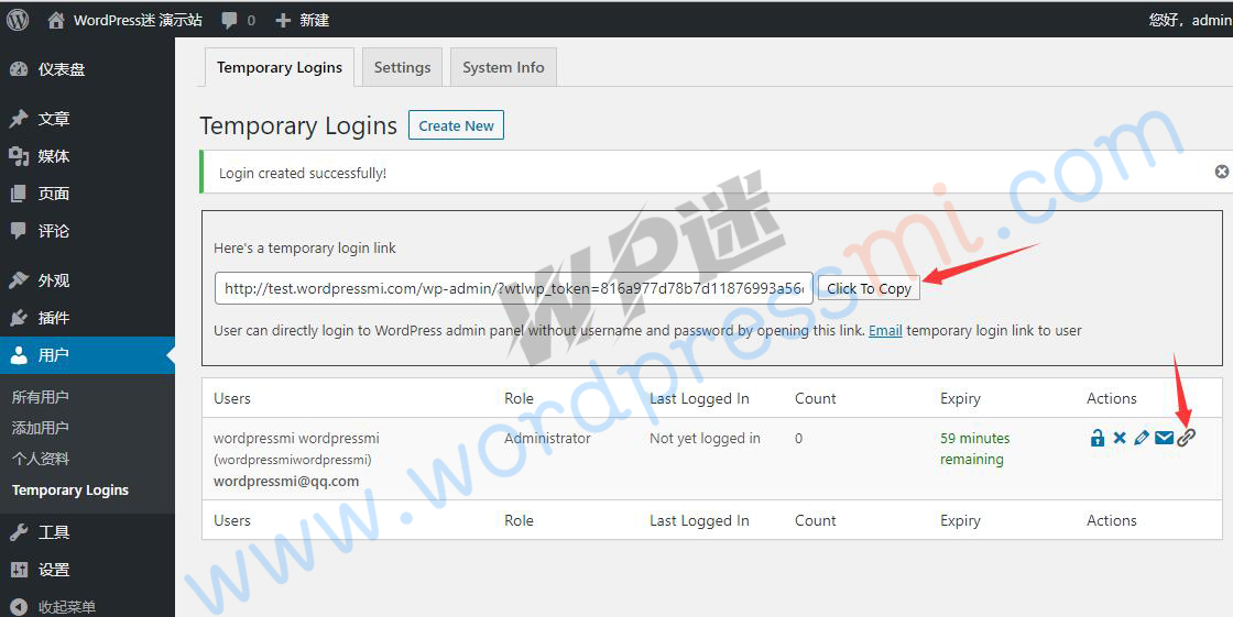 使用方法比较简单,在后台依次打开【用户 – Temporary Logins】,然后点击创建Create New,即可打开下图显示的创建弹窗:
